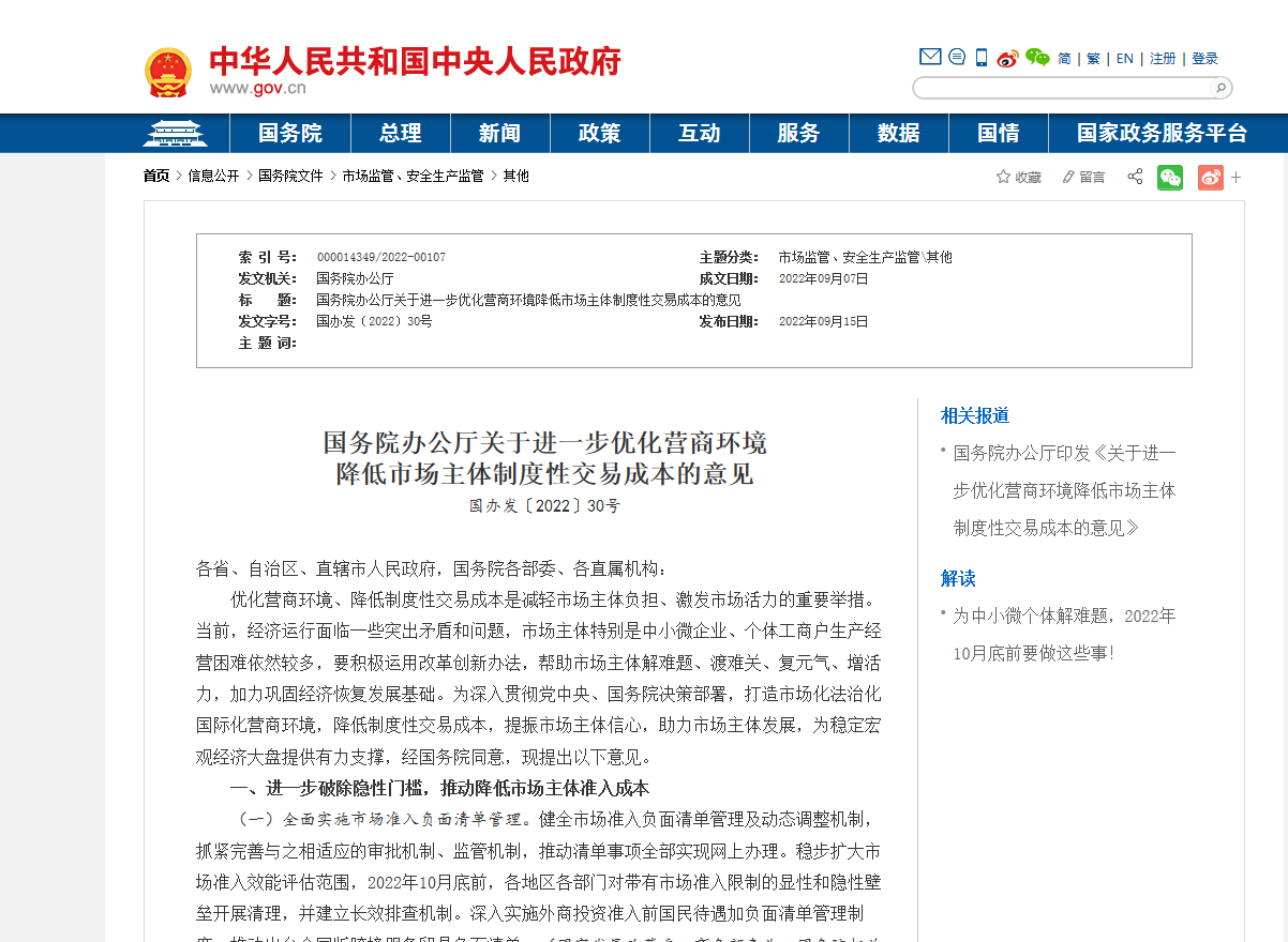 国务院办公厅关于进一步优化营商环境 降低市场主体制度性交易成本的意见 国办发〔2022〕30号 各省、自治区、直辖市人民政府,国务院各部委、各直属机构: 优化营商环境、降低制度性交易成本...