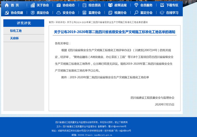 “四川省省级安全生产文明施工标准化工地”是四川省建筑施工安全最高奖项,由四川省住房和城乡建设厅主导,省建设工程质量安全与监理协会检查验收,权威性强,含金量高。评审依据为《四川省省级安全生产文明施工标准化工地评审办法》(川建发[2007]14号)、《建筑施工安全检查标准》JGJ59-99,以及国家和地方有关标准、规范规程,反映项目施工过程中安全生产管理和文明施工达到省内先进水平,具有较好的经济效益和社会效益。