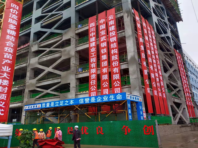 四价流脑多糖结合疫苗产业化暨多糖结合疫苗扩产扩能项目总用地面积1626㎡,新建厂房为钢框架结构,建筑物高度为50.95m,地下一层、地上六层,单层建筑面积约1480㎡,总建筑面积约为16258.10㎡,项目总投资6500万。四川中建建业工程有限责任公司项目团队秉承“科学管理、安全生产、文明施工、诚信守约、质量第一”的理念,克服钢构件单件重量大,长度长吊装风险大;现场各工序与钢结构交叉施工、安全防护难度大;现场场地狭小,施工组织难度大;安装精度高,垂直度控制难度大等工程重、难点问题,严控质量安全,积极兑现承诺,打造精品工程,彰显了四川中建建业人诚信践诺、锐意进取的风采,给业主交上了一份满意的答卷。