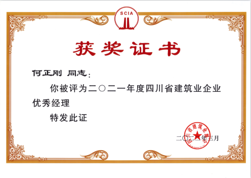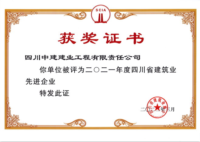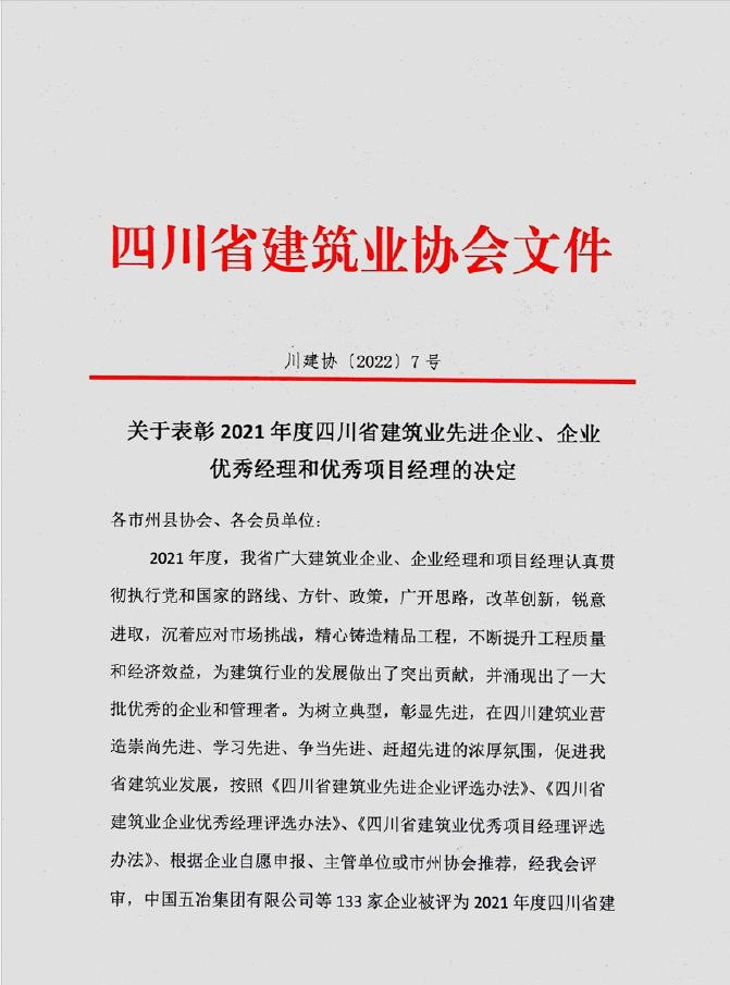 近日,四川省建筑业协会发文表彰了一批2021年度四川省建筑业“先进企业”和四川省建筑业“企业优秀经理”及“项目经理”,四川中建建业工程有限责任公司荣获四川省建筑业“先进企业”称号,公司董事长何正刚荣获四川省建筑业“企业优秀经理”称号,公司副总经理、一级建造师薛涛荣获“优秀项目经理”称号。