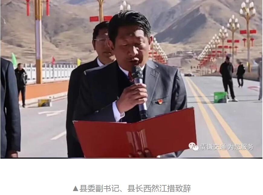 囊谦县委副书记、县长西然江措在致辞中说:今天开通南大桥不仅是一座便民桥,也是一座富民桥,更是一座连心桥。我们要充分发挥扎曲河南大桥纽带连接作用,促进东西两岸有序流动、交换提速和公共资源均衡配置;我们要聚焦民之所盼、民之所向,继续保持“逢山开路、遇河架桥”的奋发劲头,加快解决群众“急难愁盼”事项;我们要秉承南大桥“鱼跃龙门、年年富余”的美好寓意,打造更多经得起历史检验、经得起人民检验的“精品工程”“民心工程”。大家要以此次开通为新起点,始终与群众手牵手、心连心,同人民想在一起、干在一起,风雨同舟、同甘共苦,凝心聚力把富强美丽平安幸福囊谦建成老百姓希望的模样。