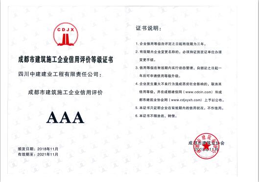 按照《成都市建筑业协会建筑施工企业信用评价管理办法》、《关于继续开展协会建筑施工企业信用评定工作的通知》,经专家组考评及复审确定,我公司被成都市建筑业协会评为:成都市建筑施工AAA级信用企业。